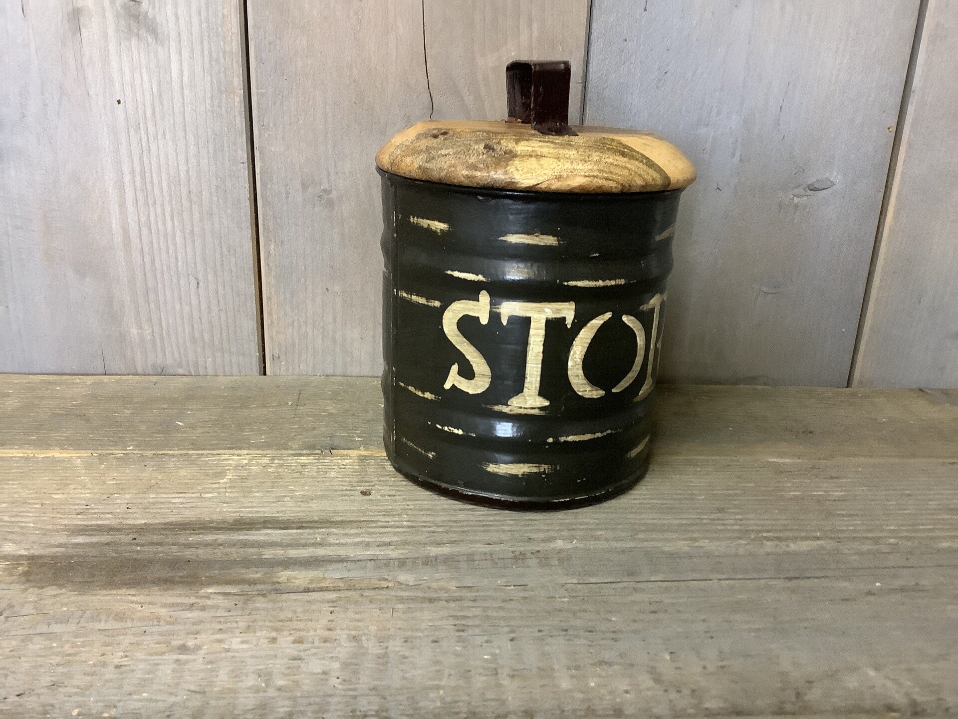 Ijzeren voorraad pot met houten deksel